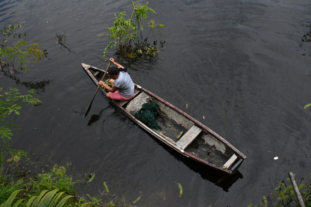 May 2024, in El Chino, Loreto Region, Peru. Wet season, community member harvesting from fruit trees along the riverbanks, and placing the harvest on her small boat.