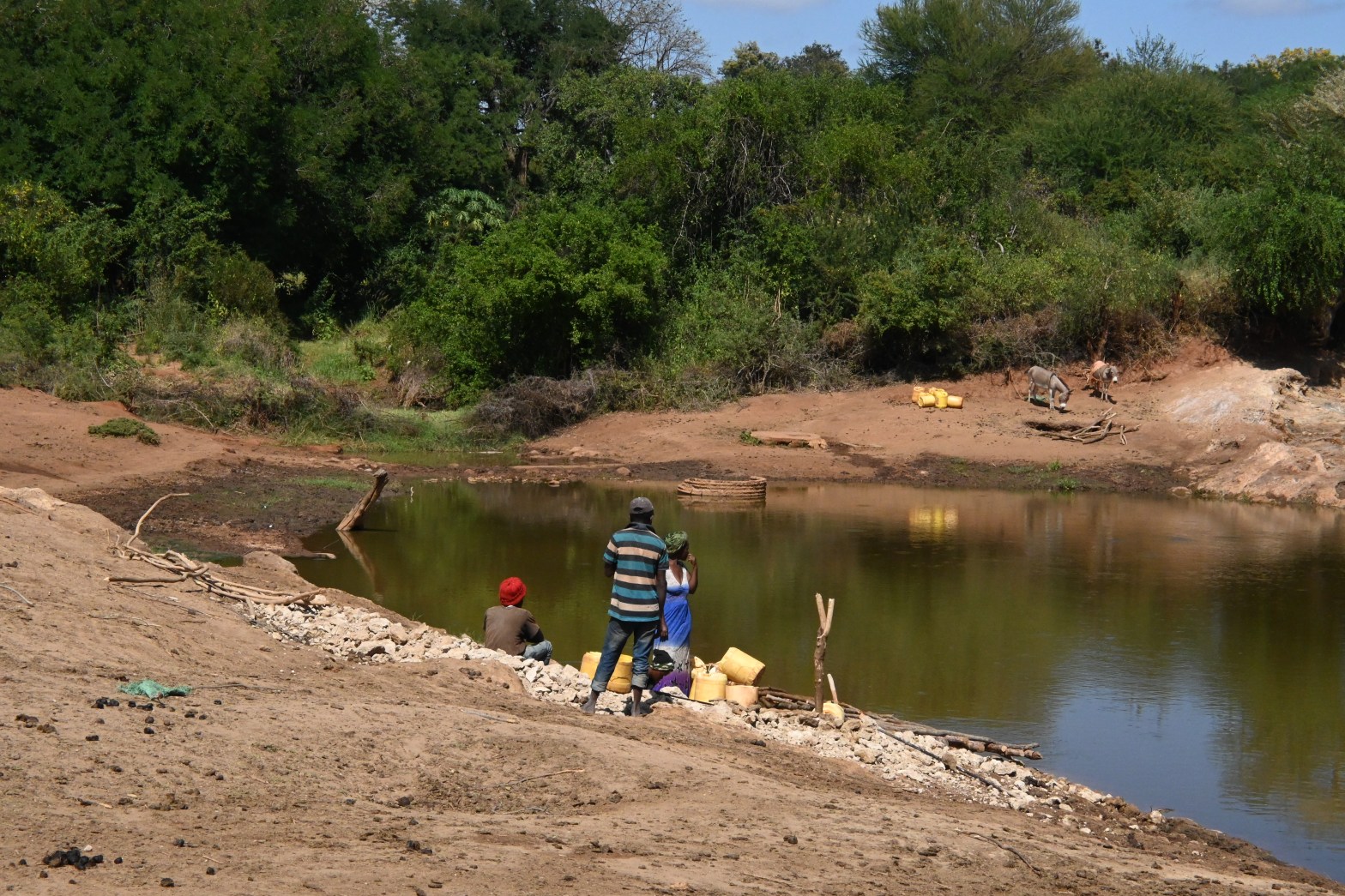 In Kitui, communities access water through water kiosks that extract water from the river (for drinking) and through scoop-holes in the dry river bed (for drinking); groundwater (through boreholes, and they also use this for drinking); and rainwater (for cooking, washing clothes, and sometimes also for drinking).
